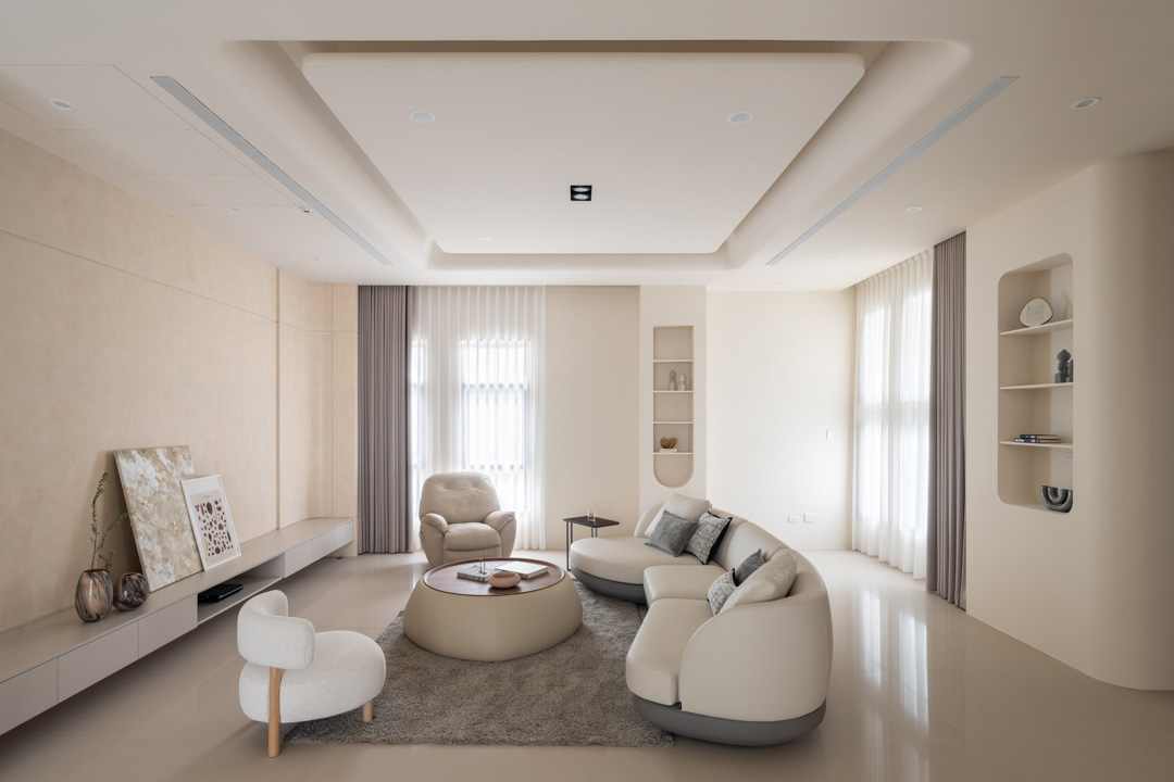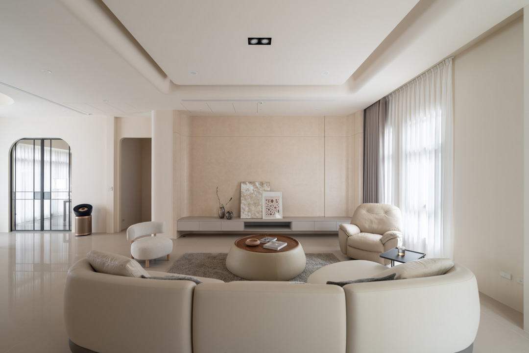 以米白與淺灰為主調,讓空間像打上一層柔焦濾鏡,軟裝、天花、拱門都以弧形收邊,整體空間去除銳