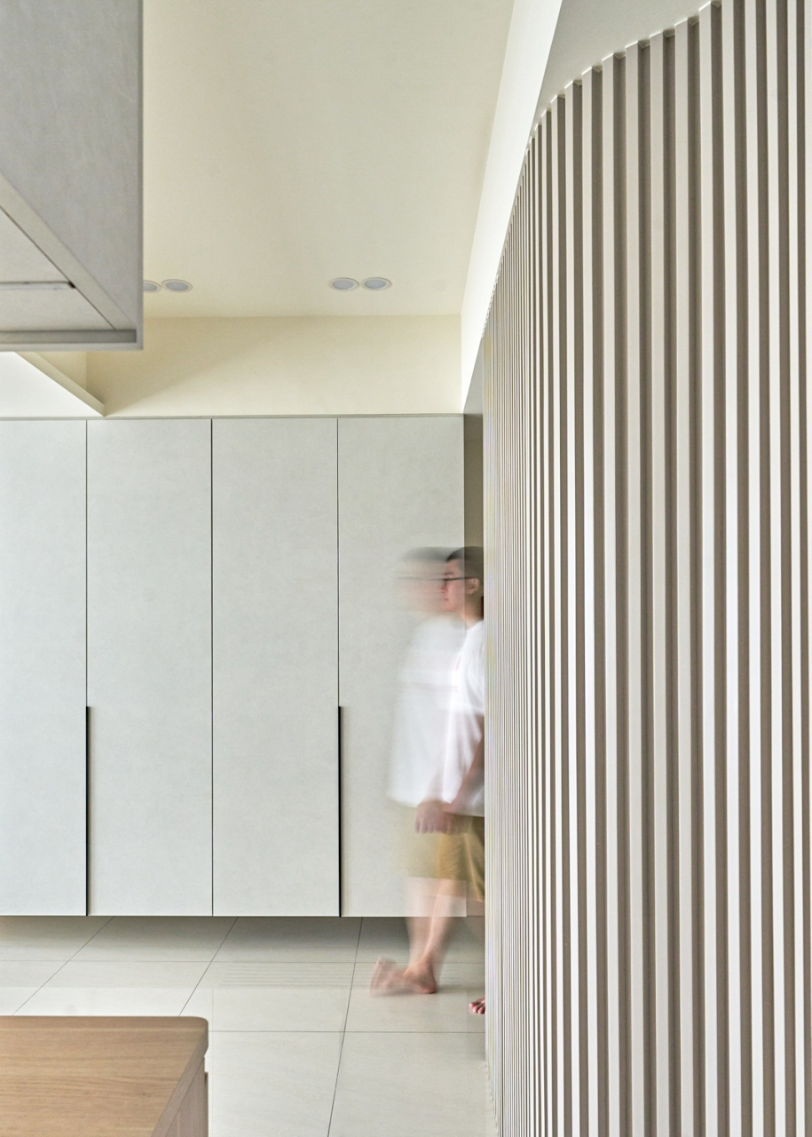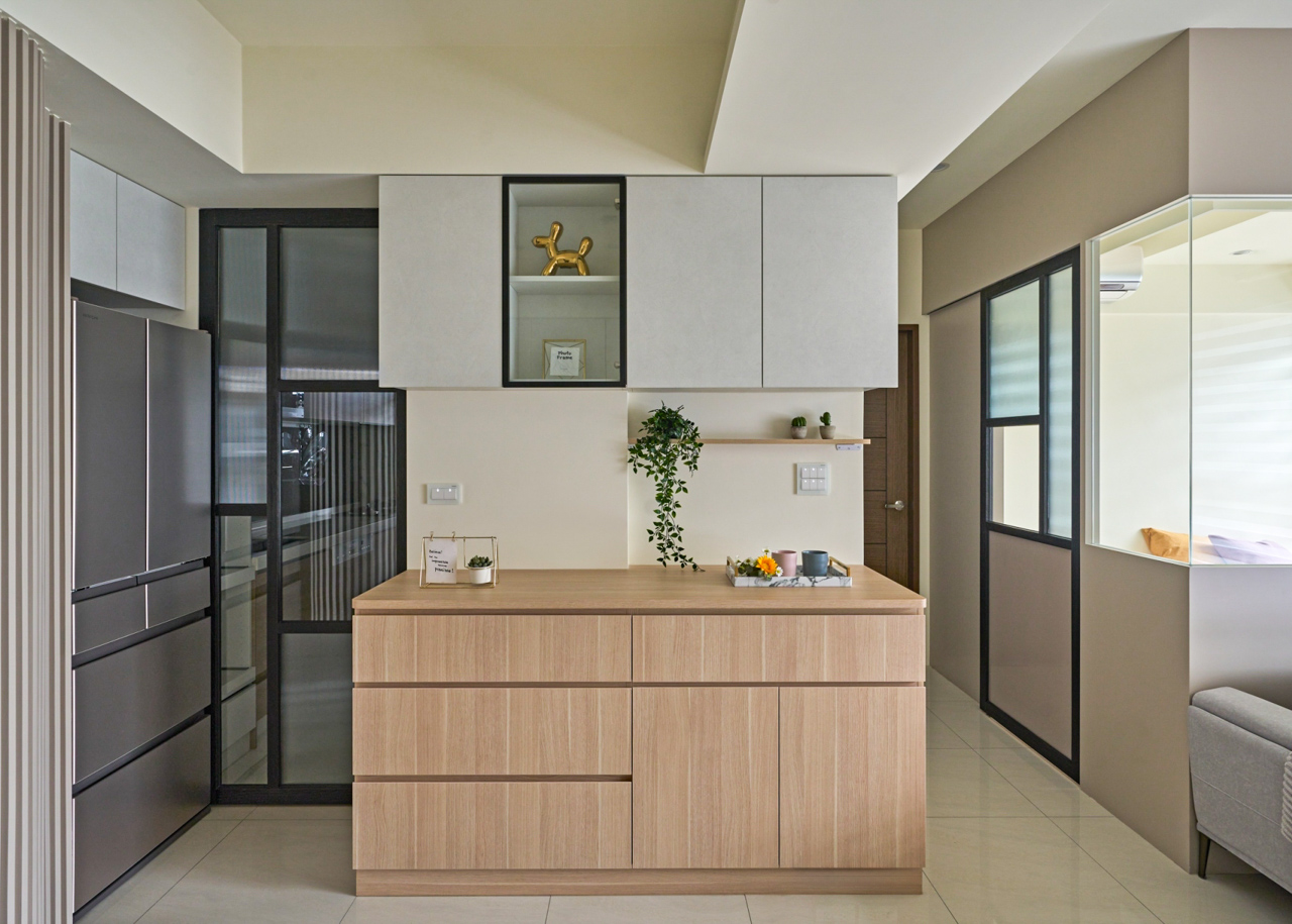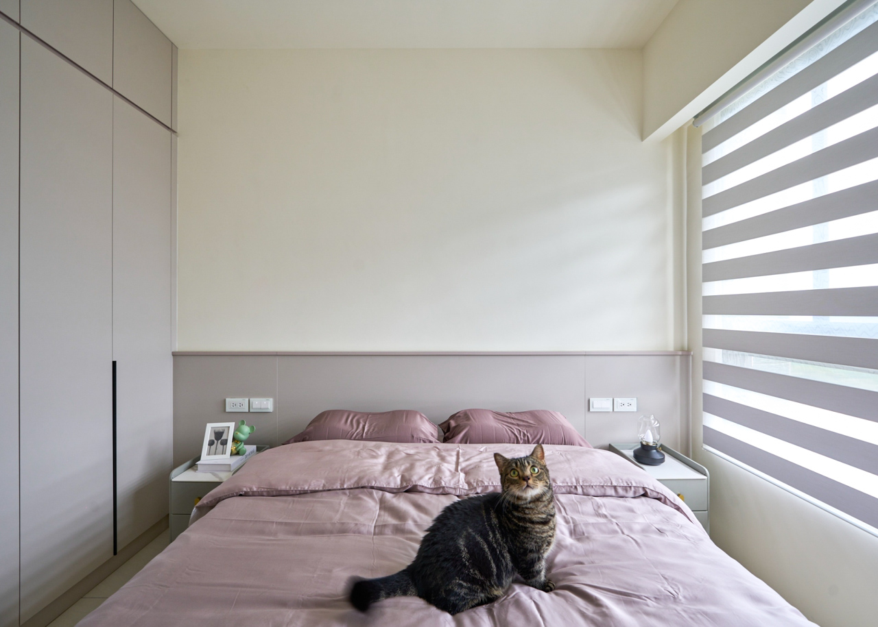 整體色調純淨舒適,隱形格柵門為設計小巧思,屋內空間為毛小孩周到設想。