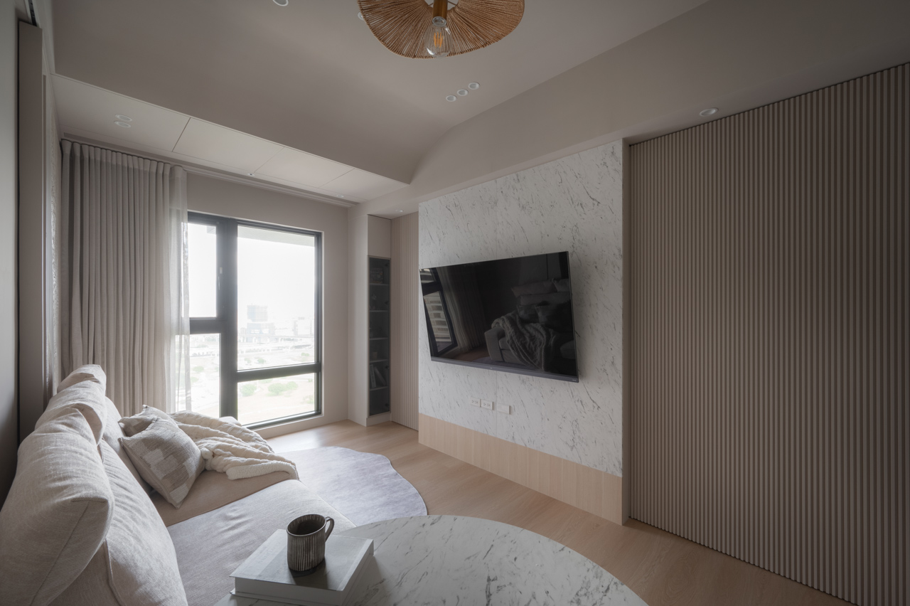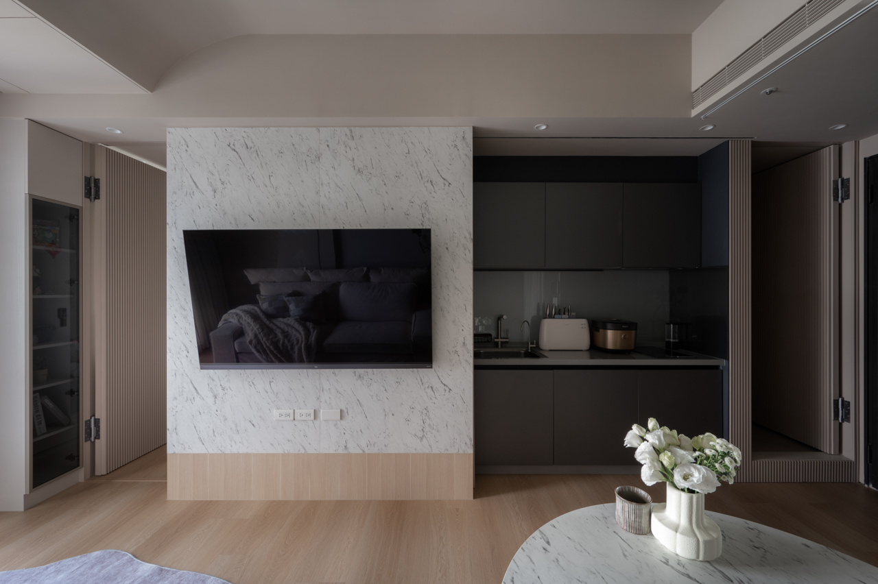 大理石紋電視牆面、圓桌相呼應高雅不俗。